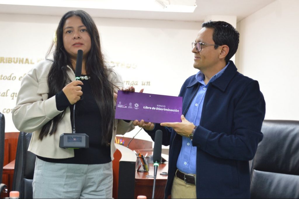 Nohemí Hinojosa Castillejo hizo entrega de la placa de ser un espacio libre de cualquier discriminación al Magistrado Adrián Hernández Pinedo, quien dijo recibir con agradecimiento para que este órgano jurisdiccional se constituya como una institución libre de discriminación.