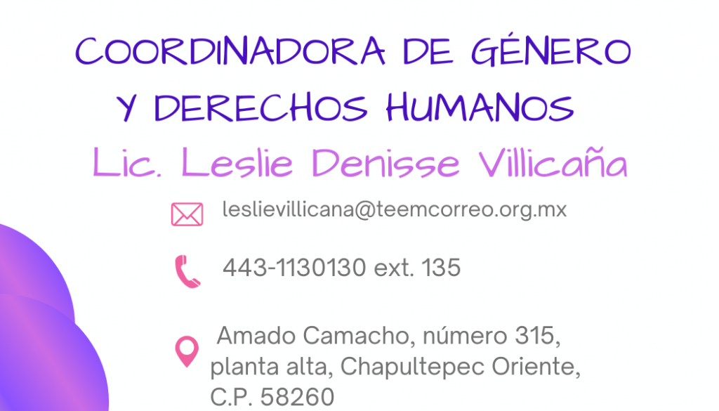 COORDINACIÓN DE GÉNERO Y DERECHOS HUMANOS Noticias TEEMICH FIRMA DECLARATORIA DE LA IGUALDAD Y NO DISCRIMINACIÓN.ver masTEEMICH modifica acuerdo de paridad de género en asignación de personas juzgadoras en materia civil para Morelia y Uruapanver masTEEMICH prioriza la Salud Mental de su personal.ver masEn Michoacán 98 casos registrados por Violencia Política contra la Mujer en Razón de Género.ver masTEEMICH se actualiza en estrategia “Punto Naranja”.ver mas Efemérides Mujeres Magistradas del Tribunal Electoral del Estado COORDINACÍON DE GÉNERO Y DERECHOS HUMANOS UBICACIÓN