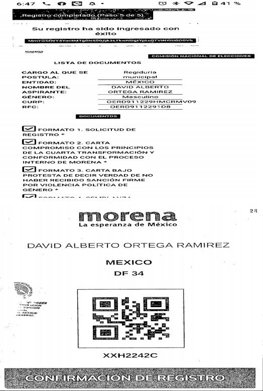- Impresión de captura de pantalla de su registro ingresado con éxito a la plataforma de Morena, en el cual se visualizan marcas de cotejo en sus anexos siendo estos los siguientes: Formato 1. Solicitud de registro, Formato 2. Carta compromiso con los principios de la cuarta transformación y conformidad con el proceso interno de Morena17.
