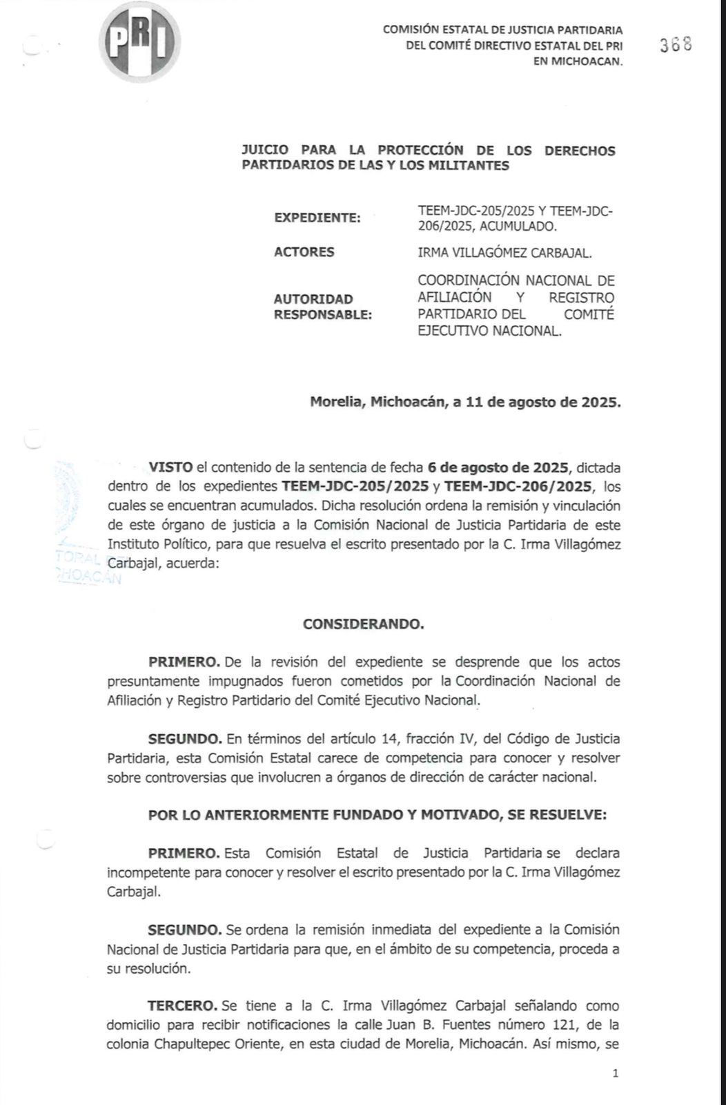 • Copia certificada el oficio PRI/CDE/MICH/20J.7/10/01/2025 de doce de agosto, signado por el Secretario General de Acuerdos de la Comisión Estatal, por el que remitió las constancias originales de los expedientes TEEM-JDC-205/2025 y acumulado al Comité Ejecutivo Nacional del PRI.[26]