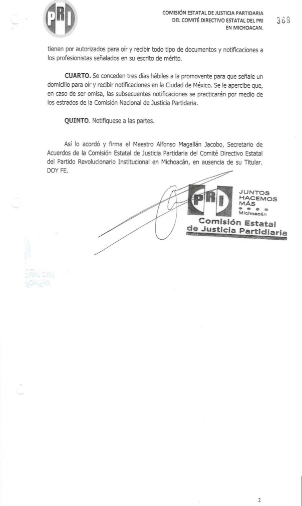NOTIFÍQUESE. Personalmente a la parte actora; por oficio a las autoridades responsables, a la Comisión Estatal de Justicia Partidaria del Partido Revolucionario Institucional en Michoacán y a la Comisión Nacional de Justicia Partidaria del Partido Revolucionario Institucional y por estrados a los demás interesados, de conformidad con los artículos 37 fracciones I, II y III, 38 y 39 de la Ley de Justicia en Materia Electoral y de Participación Ciudadana del Estado de Michoacán de Ocampo; así como 137 párrafo primero, 139, 140 y 142 del Reglamento Interior del Tribunal Electoral del Estado.