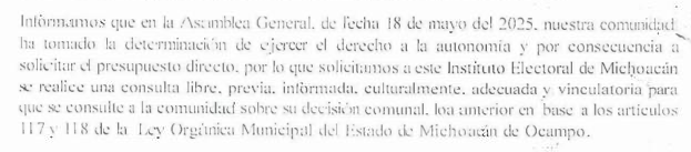 1.1 Asamblea General de la Tenencia de [No.9]_ELIMINADA_la_Tenencia_[29]. El dieciocho de mayo, habitantes de [No.10]_ELIMINADA_la_Tenencia_[29], tenencia del municipio de [No.11]_ELIMINADO_el_Municipio_[28], Michoacán,[3] realizaron una Asamblea General en la cual se aprobó solicitar el recurso directo del presupuesto público que proporcionalmente les corresponde al Ayuntamiento de [No.12]_ELIMINADO_el_Municipio_[28], Michoacán.[4]