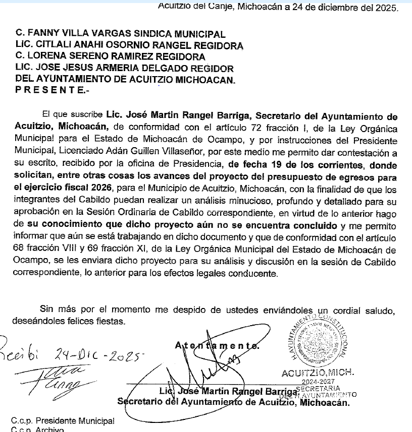 En efecto, durante el desahogo del punto de asuntos generales de la Trigésima Sexta Sesión Ordinaria de Cabildo, celebrada el veinte de diciembre de dos mil veinticinco, el Presidente Municipal dio cuenta expresa del escrito presentado el diecinueve de diciembre por la Síndica Municipal y diversas regidoras y regidores, mediante el cual solicitaron el avance del Presupuesto de Egresos para el ejercicio fiscal dos mil veintiséis. En dicha sesión, el Presidente Municipal manifestó ante el Cabildo que el presupuesto aún no se encontraba concluido, precisando que resultaba improcedente remitir avances parciales del documento, al no contar todavía con una versión integrada susceptible de análisis, circunstancia que fue del conocimiento de las y los integrantes del Ayuntamiento y quedó asentada en el acta correspondiente.