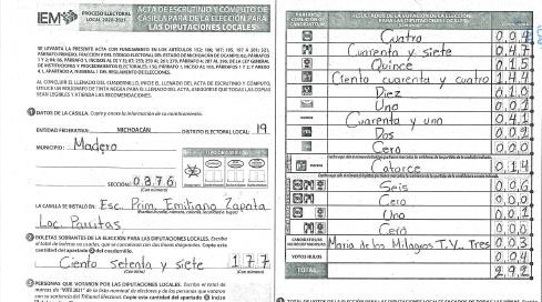Empero lo anterior, asimismo este Tribunal Electoral advierte que de las constancias remitidas por las partes y las autoridades responsables específicamente en el Acta del Consejo Distrital 19 de Tacámbaro, Michoacán, relativa a la Declaratoria de validez de la elección de diputaciones por el principio de mayoría relativa, respecto del proceso electoral 2020-2021 de fecha diez de junio pasado88, y del informe circunstanciado de la autoridad responsable de data dieciocho de junio, se advierte en lo que aquí interesa que: