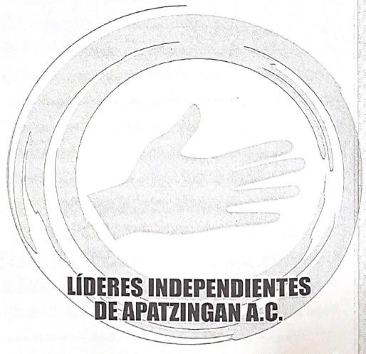 En la parte inferior central en texto color negro se lee la leyenda “LÍDERES INDEPENDIENTES DE APATZINGÁN A.C.”. |
