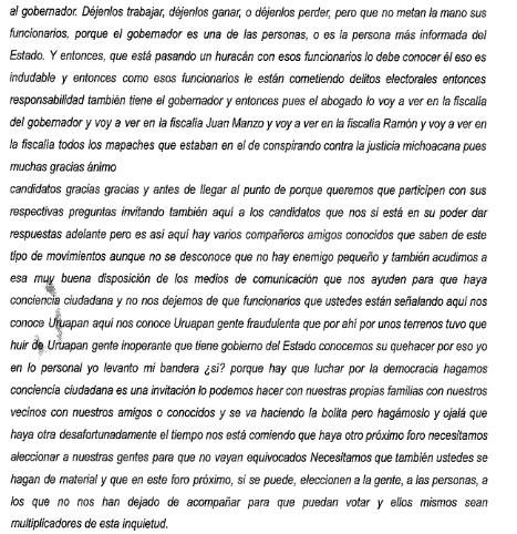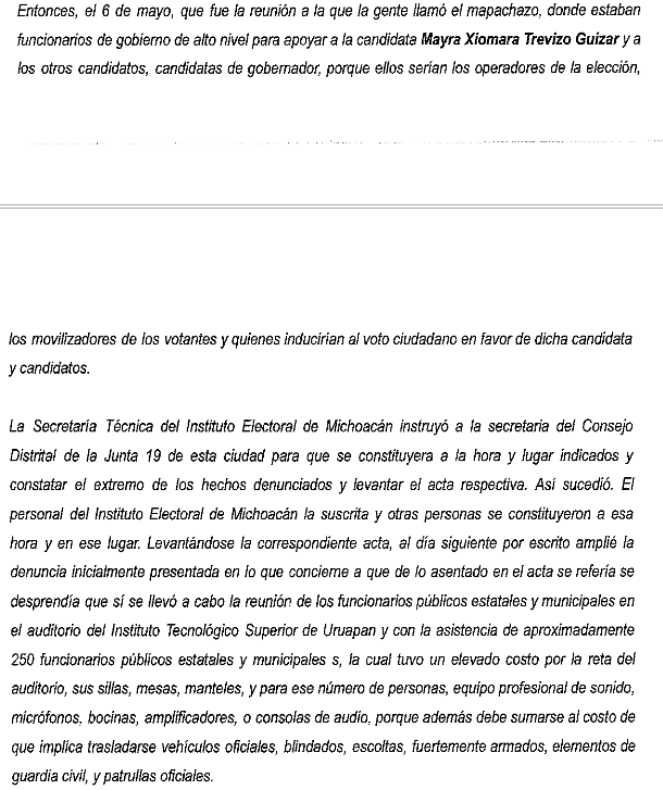 • A las dieciséis horas del diecinueve de mayo, en el Auditorio Sindicato Único de Empleados de la Universidad Michoacana, se llevó a cabo el evento denominado “Foro público, informativo y gratuito Democracia o antidemocracia” organizado por Desarrollo Social para Uruapan y la mesa Purhépecha A.C. y Asociación Libre de Abogados “In aeternum”, al cual acudió la denunciada y realizó una serie de aseveraciones que implican calumnias y faltas a la verdad, que afectan su imagen y honor.