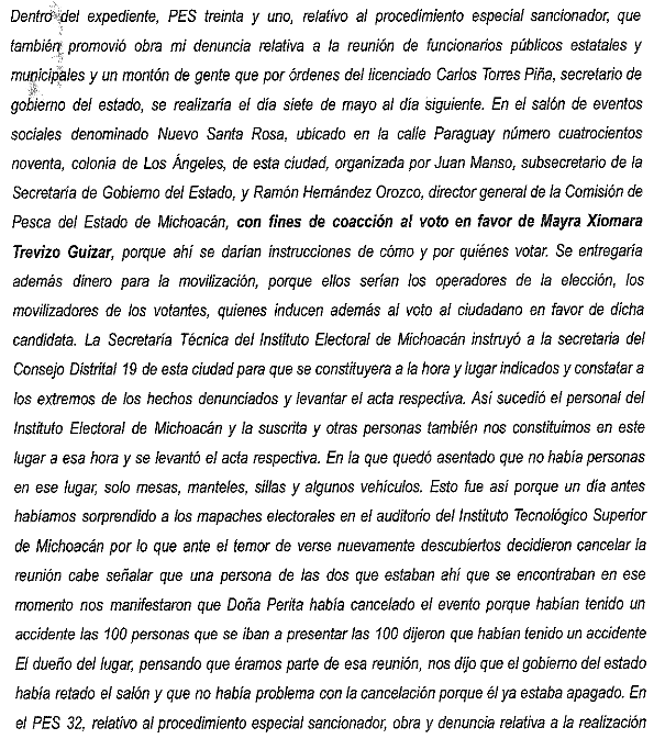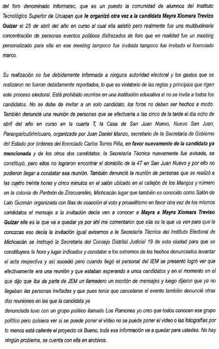 1. Queja.[5] El veintinueve de mayo, la denunciante presentó ante IEM escrito de queja en contra de la denunciada, por hechos presuntamente constitutivos de infracción en materia electoral.