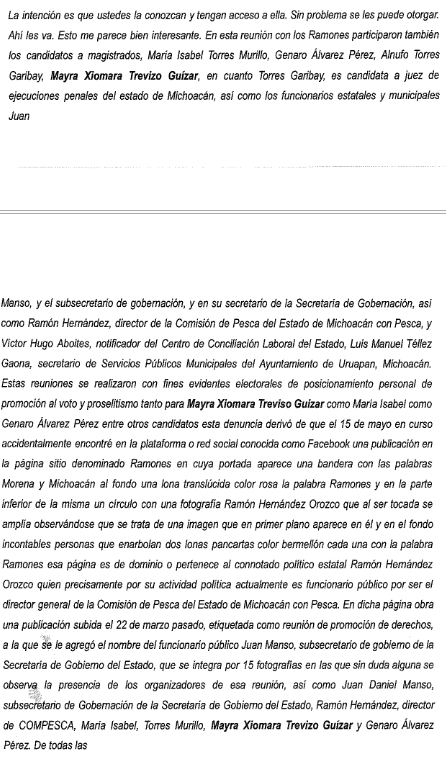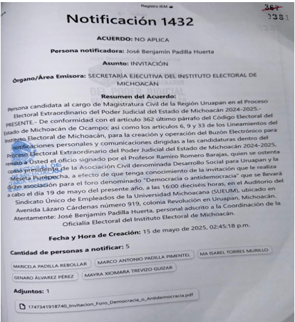 • Que fue invitada a un foro denominado “Democracia o antidemocracia” al igual que a todas las candidatas y candidatos a magistradas y magistrados de la Región de Uruapan, Michoacán.
