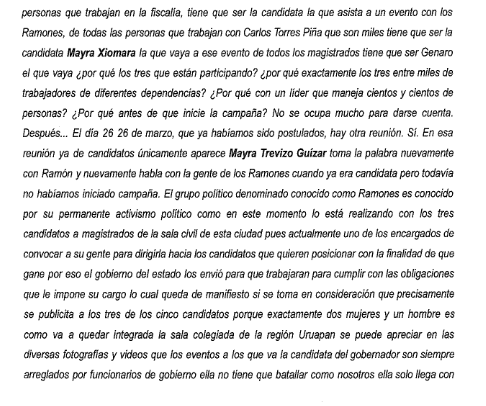 • Acudió al foro en donde habló brevemente de las denuncias y quejas que presentó, en contra de las acciones ilícitas que funcionarias del actual gobierno cometieron al intervenir en las pasadas elecciones de personas juzgadoras, lo cual la perjudicó, pues dichas acciones, la colocaron en desigualdad de condiciones en las elecciones del Poder Judicial del Estado.