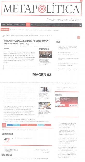 - Que el veinticuatro de mayo, se publicó en la red social “Facebook”, y en la página de internet del medio de comunicación “Metapolítica”, una nota periodística en la que reproducen diversas manifestaciones realizadas por Miguel Ángel Villegas Soto, otrora candidato a regidor para el Ayuntamiento de Morelia, las cuales constituyen calumnia electoral en su contra.